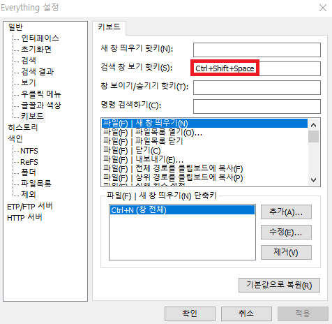 에브리씽 실행을 위한 단축키를 설정해두시는 것이 필요합니다.