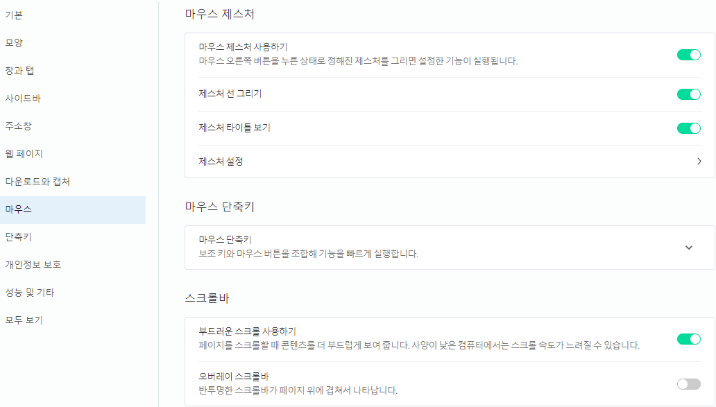 (마우스 제스처 기능이란 마우스 우클릭 상태에서 드래그 앤 드롭을 해서 특정한 모양을 그려서 특정 기능을 수행하도록 하는 거예요. 익숙해지면 업무 시간이 굉장히 단축돼서 좋습니다)