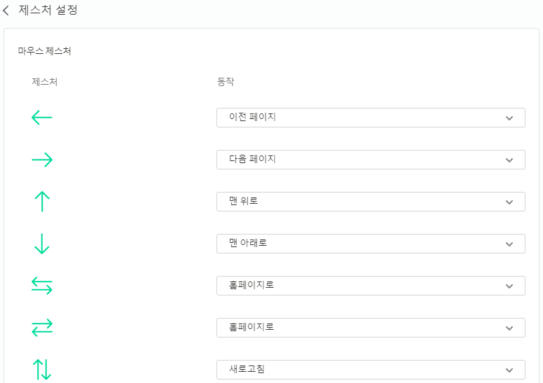 점3개 -> 설정 -> 마우스 설정 -> 제스처 메뉴로 넘어가시면 제스처를 설정할 수 있습니다.
