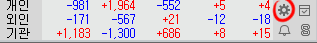 카이로스 HTS의 우측 하단(툴바/티커바라고도 함)을 보시면 수급동향을 볼 수 있는 창의 우측에 톱니바퀴처럼 생긴 버튼이 있습니다.