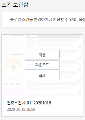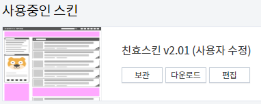 그럼 여기서 아까 눌렀던 '스킨 등록+' 버튼의 아래에 보시면 '스킨 보관함>'이란 버튼이 있어요.