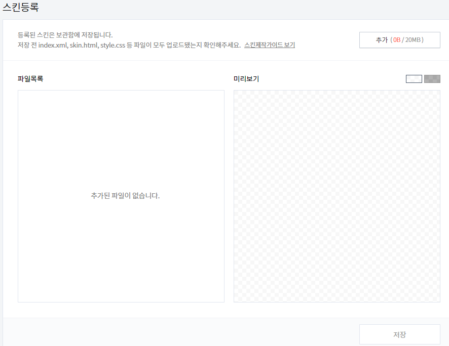 스킨 변경 메뉴에서 '스킨 등록+' 버튼을 눌러주시면 다음과 같은 화면이 나올거예요.