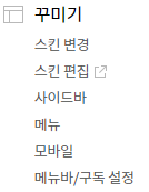 '꾸미기' 메뉴에서 '스킨 변경' 메뉴로 들어가면 다음과 같이 스킨 목록이 나옵니다.