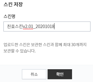 확인 버튼을 누르시면 이제 스킨을 업로드하는 과정이 모두 끝났어요!!