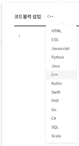 코드블럭 삽입이라고 써있는 우측에 언어명을 누르시면 아래로 리스트가 펼쳐질거예요.