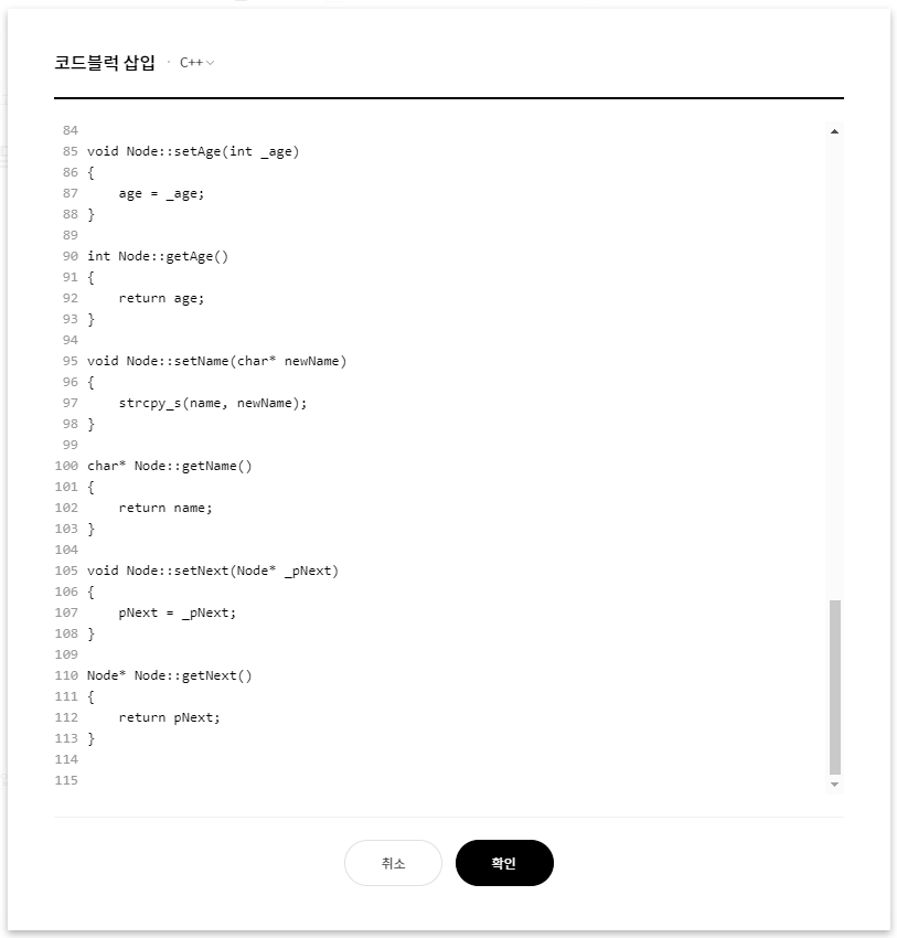 소스코드를 수정하거나, 지원하는 언어를 수정하려면, 소스코드를 한 번 누르면 소스코드의 위에 <> 같이 생긴 버튼이 나올 거예요. 거기에 마우스를 갖다 대면 코드블럭이라고 나오는데, 그걸 눌러주면 수정할 수 있습니다.