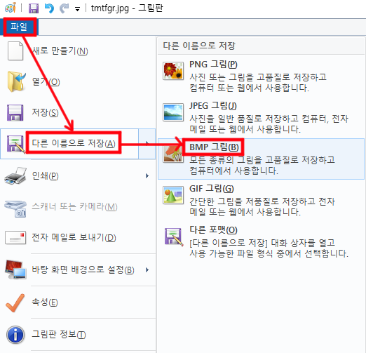 다른 이름으로 저장을 누르고 bmp 확장자의 파일로 저장애 줍니다.
