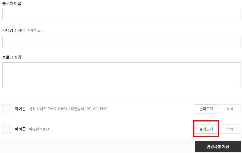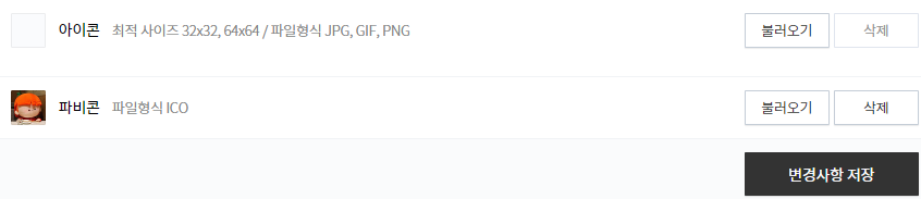 파비콘이라고 되어 있는 곳의 우측의 '불러오기'를 눌러서 방금 만든 ico확장자의 파일을 불러옵니다.